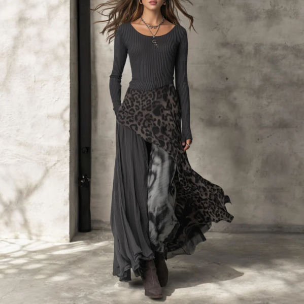 Abito lungo dal fascino sofisticato e contemporaneo, perfetto per chi ama distinguersi con eleganza. Il corpetto a costine avvolge la silhouette valorizzandola, mentre la gonna ampia e fluida crea un movimento armonioso ad ogni passo. L’inserto leopardato dona carattere e personalità al design, bilanciando femminilità e grinta in modo raffinato.